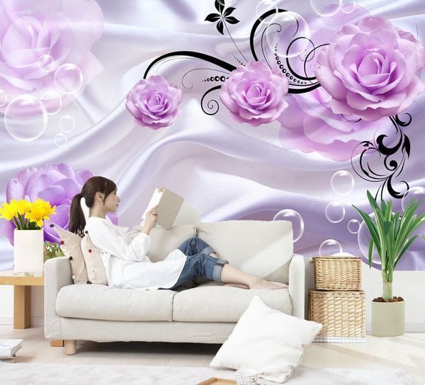 Grosshandel Benutzerdefinierte Fototapete 3d Floral Purple Rose Silk Hintergrund Moderne Einfache Romantische Wohnzimmer Schlafzimmer Wand Design