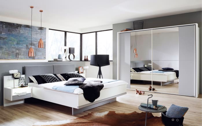 Schlafzimmer Weiss Grau Kleiderschrank Doppelbett Nachttisch