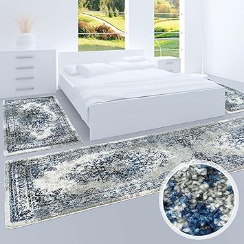 Bettumrandung Teppich Laufer Flachflor Mit Klassischen Design Ornamenten Muster In Grau Blau Fur Schlafzimmer 3 Teilig Laufer Grossen 2x 80x150